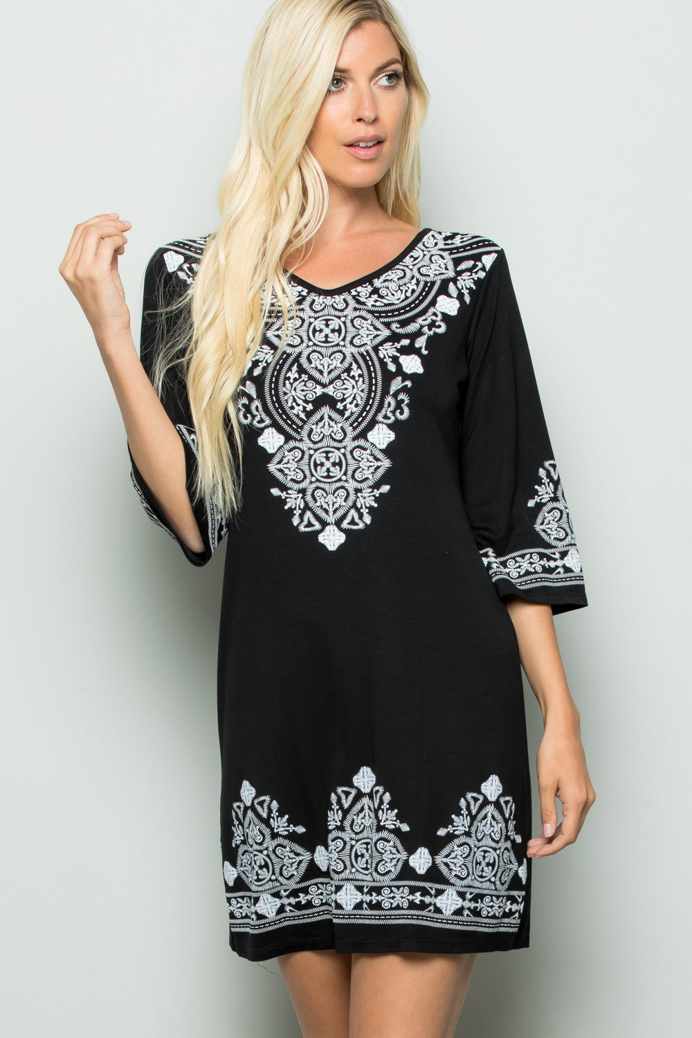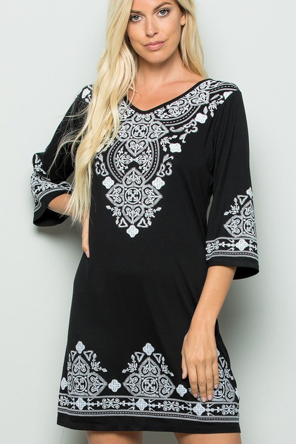 This damask print dress is very stretchy with a flattering fit and 3/4 sleeve with vneck