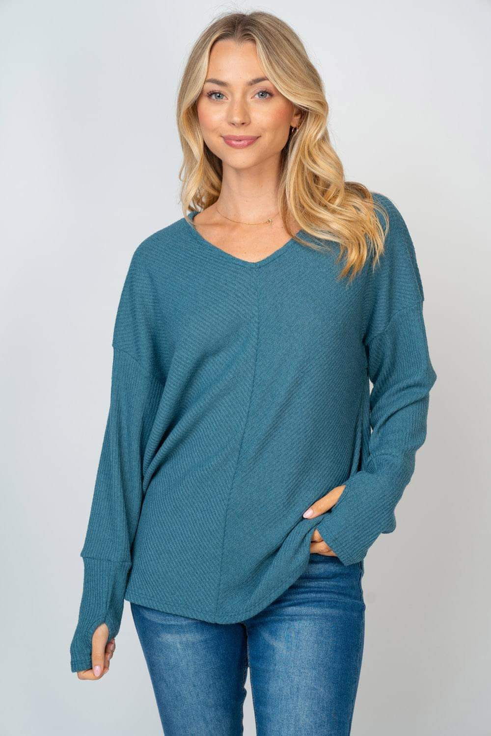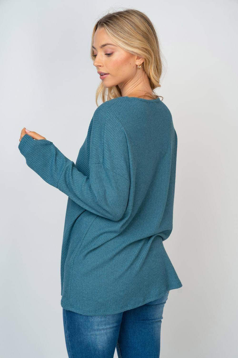 DUSTY TEAL BLUE RIBBED KNIT WITH THUMBHOLES