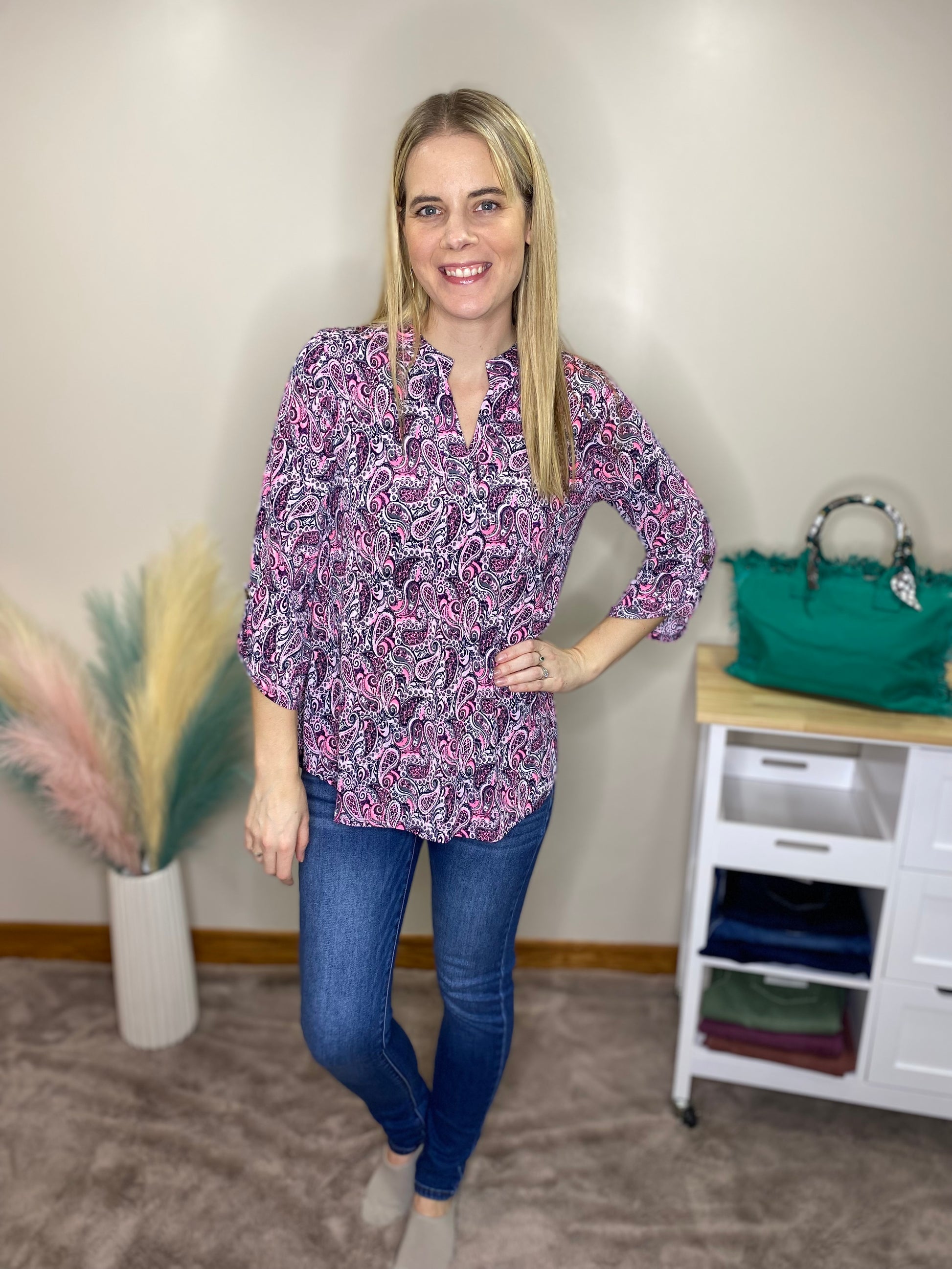 LIZZY PINK PAISLEY 3/4 BUTTON SLEEVE TOP