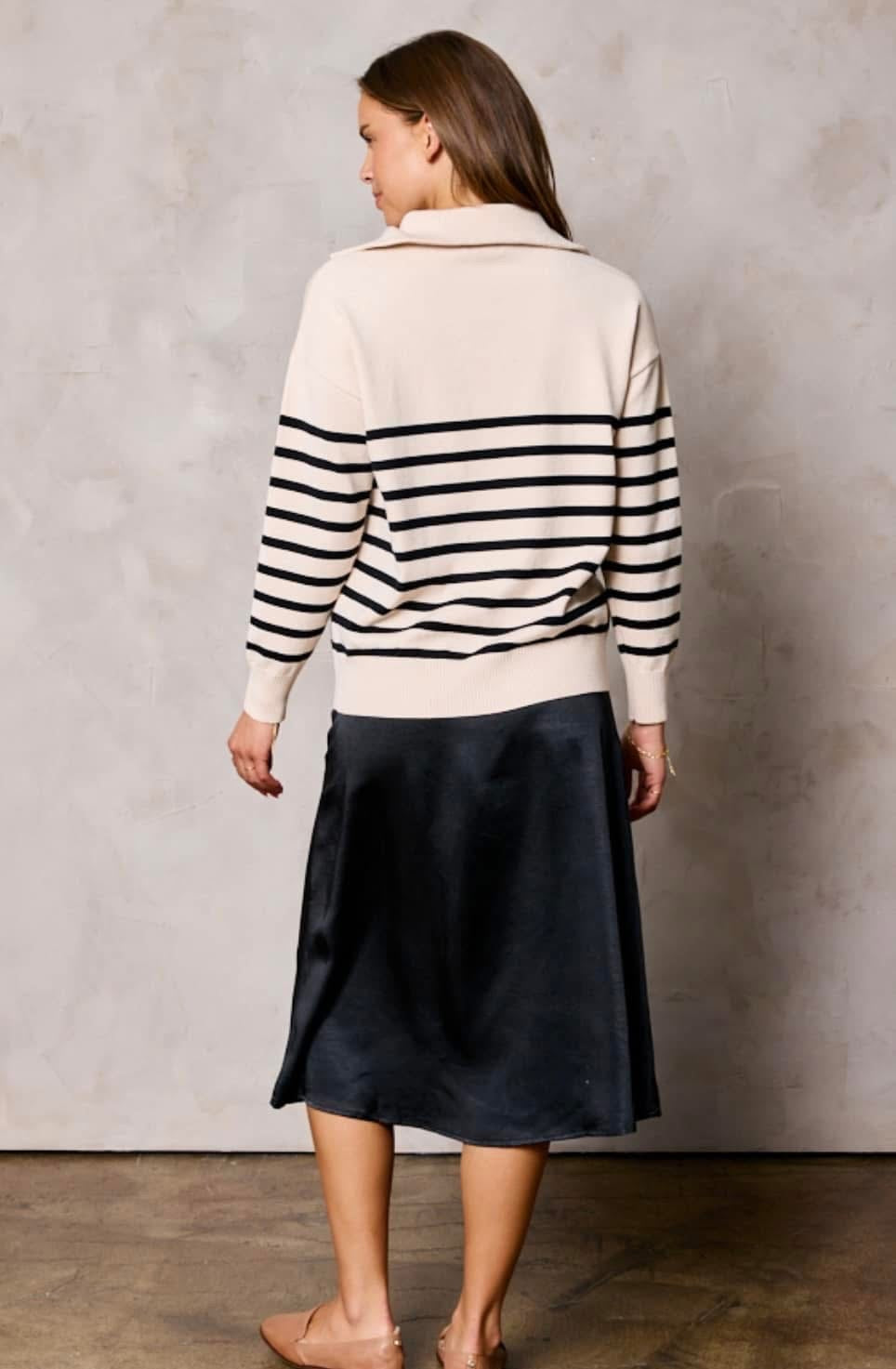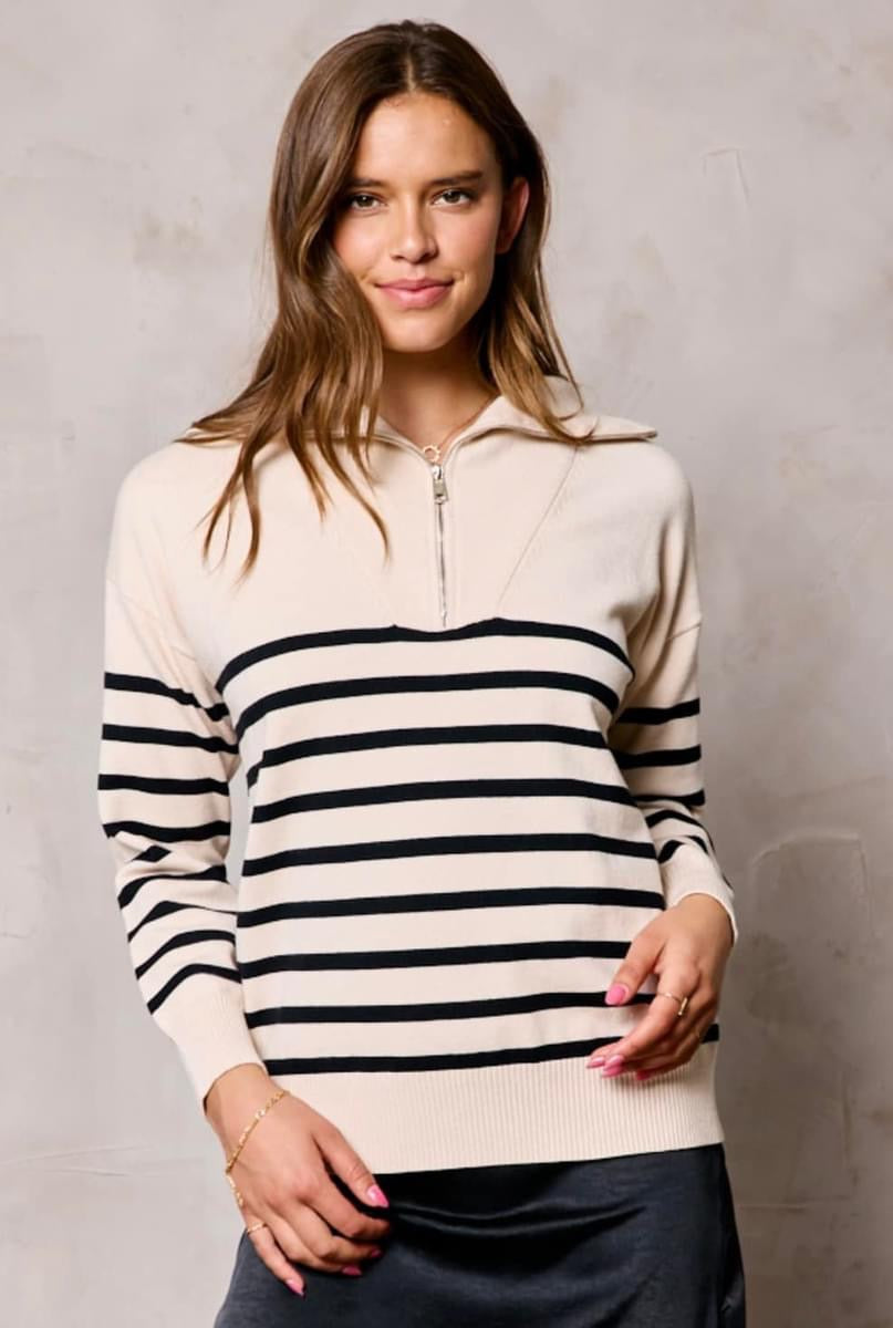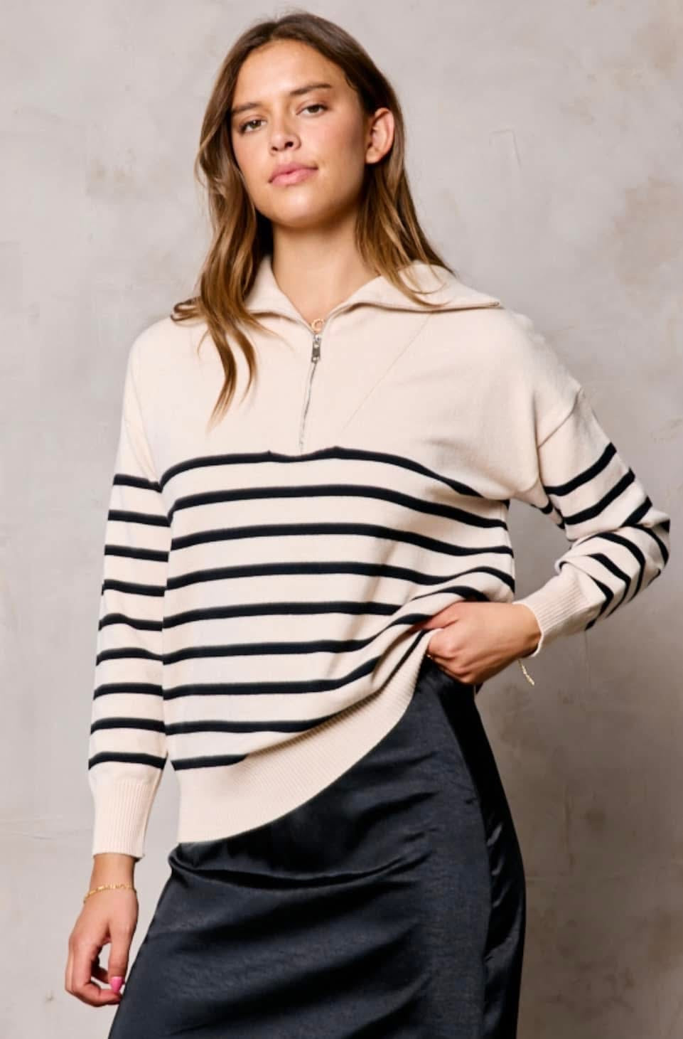 OATMEAL/BLACK STRIPE HALF ZIP SWEATER